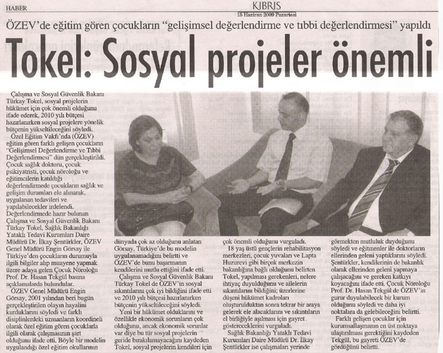 Kıbrıs 15 Haziran 2009 "Özev’de Eğitim Gören Çocukların Gelişimsel Değerlendirme Ve Tıbbi Değerlendirmesi Yapıldı. Tokel, Sosyal Projeler Önemli"
